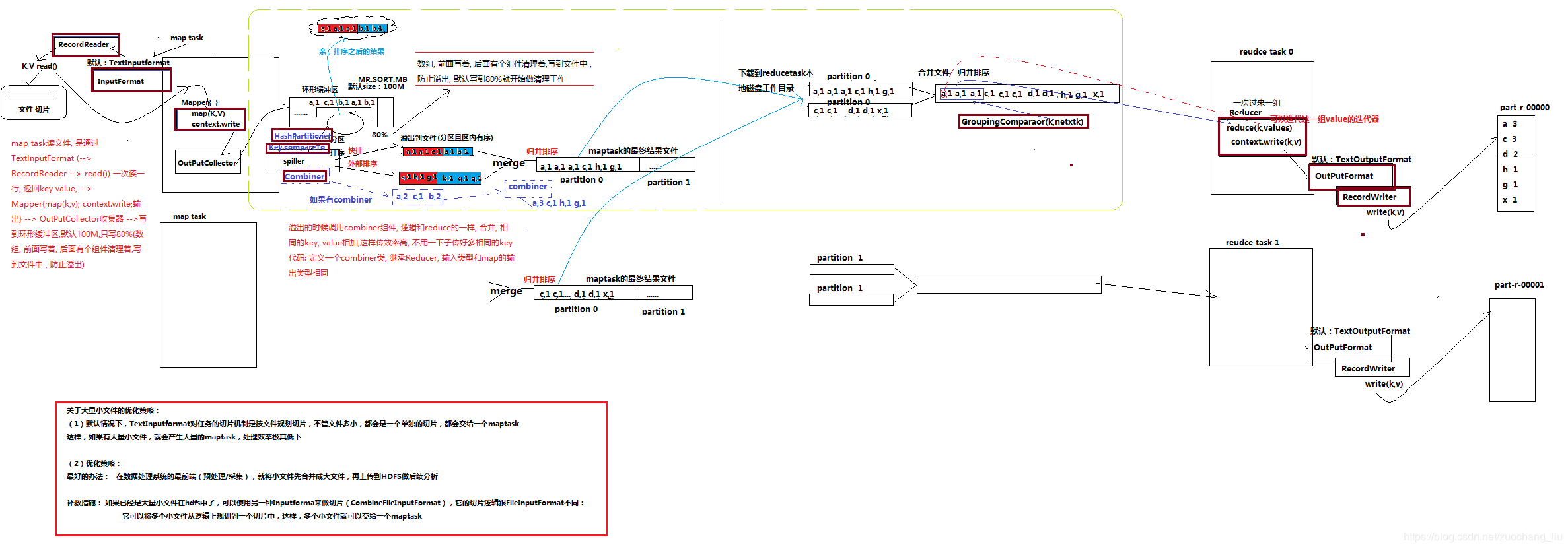 - 小文件处理优化:事先合并成大文件,combineTextInputformat,在hdfs上用mapreduce将小文件合并SequenceFile大文件(key:文件名,value:文件内容)