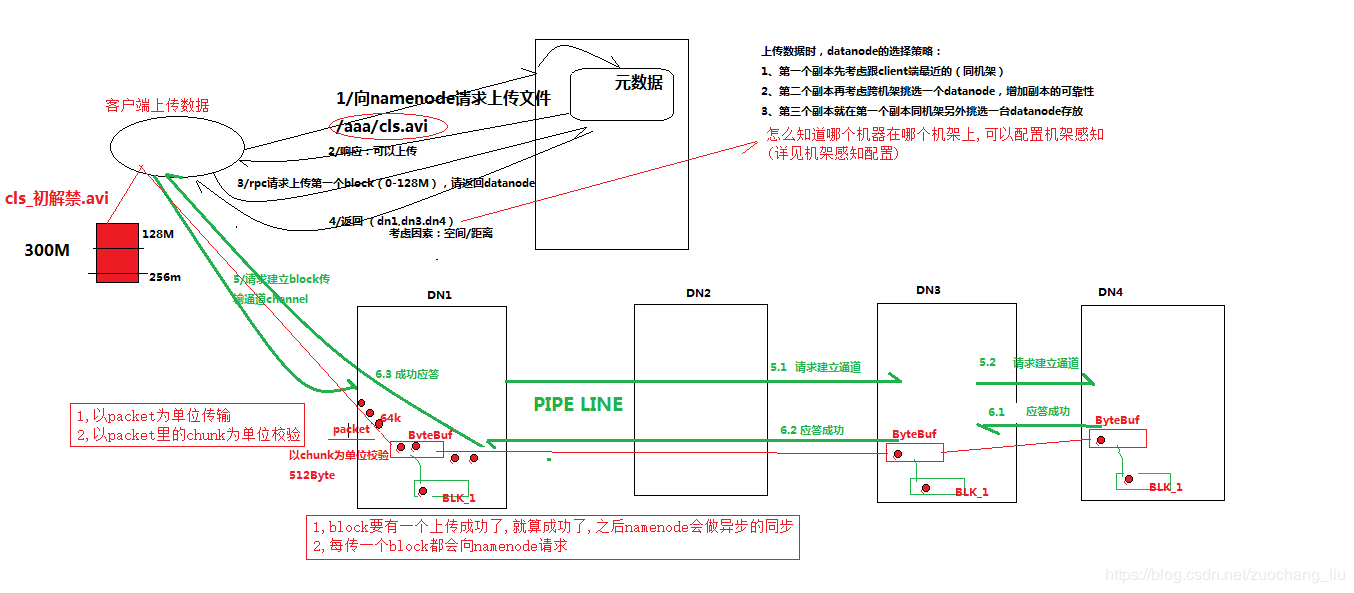 5. client请求3台dn中的一台A上传数据(本质上是一个RPC调用,建立pipeline),A收到请求会继续调用B,然后B调用C,将真个pipeline建立完成,逐级返回客户端