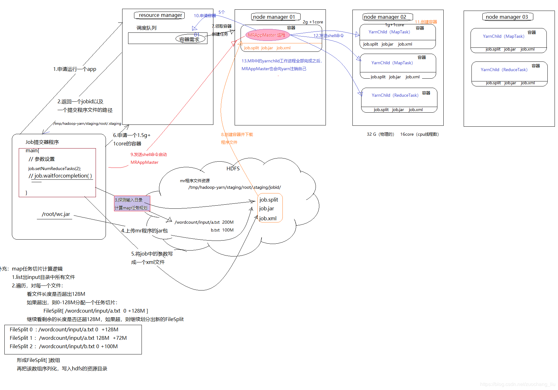 1. 一个mr程序启动的时候,最先启动的是MRAppMaster,MRAppMaster启动后根据本次job的描述信息,计算出需要的maptask实例数量,然后向集群申请机器启动相应数量的maptask进程