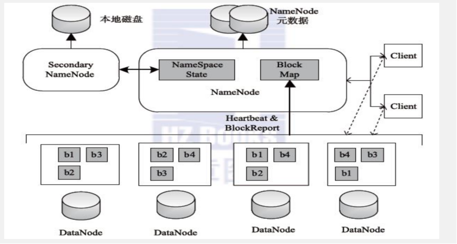 hdfs有namenode、secondraynamenode、datanode组成。为n+1模式