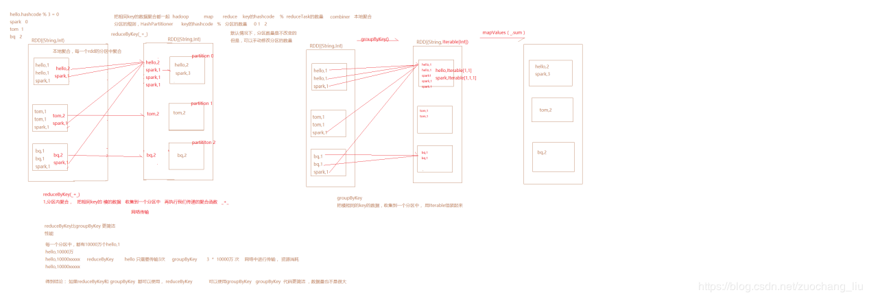 reduceByKey 会有一个分区内聚合,而groupByKey没有 最核心的区别
