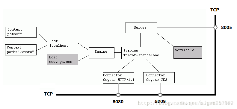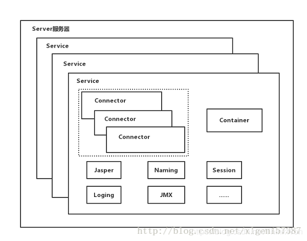 一个Tomcat中只有一个Server,一个Server可以包含多个Service,一个Service只有一个Container,但是可以有多个Connectors,这是因为一个服务可以有多个连接,如同时提供Http和Https链接,也可以提供向相同协议不同端口的连接,示意图如下(Engine、Host、Context下面会说到):