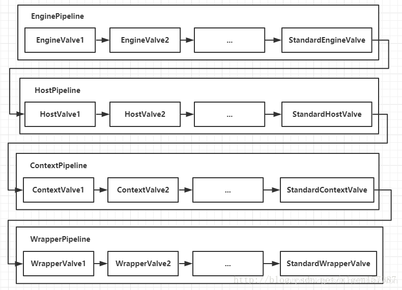 我们知道Container包含四个子容器,而这四个子容器对应的BaseValve分别在:StandardEngineValve、StandardHostValve、StandardContextValve、StandardWrapperValve。