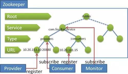 注意这里的dubbo只是一个框架,至于你架子上放什么是完全取决于你的,就像一个汽车骨架,你需要配你的轮子引擎。这个框架中要完成调度必须要有一个分布式的注册中心,储存所有服务的元数据,你可以用zk,也可以用别的,只是大家都用zk。