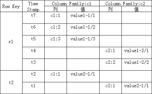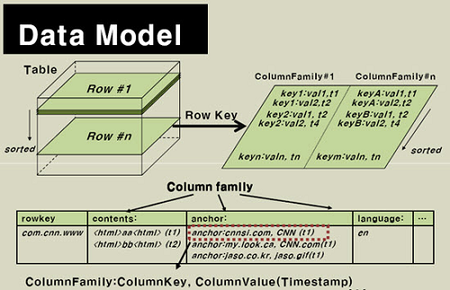 HBase通过表格的模式存储数据,每个表格由列和行组成,其中,每个列又被划分为若干个列族(row family),请参考下面的图: